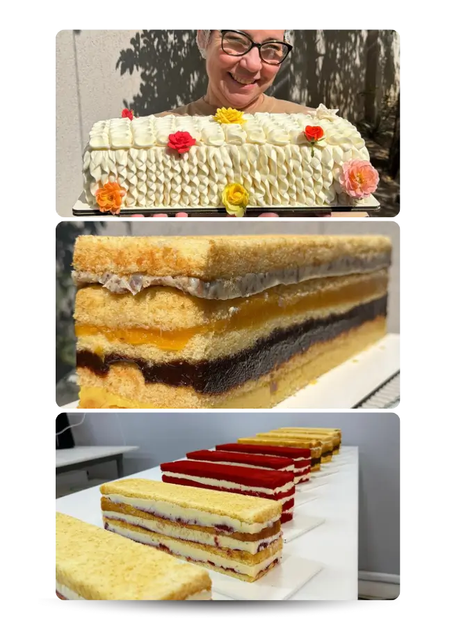 A montagem que a gente ensina foi criada pra resistir ao transporte. A fatia chega na casa da cliente do jeito que saiu da sua cozinha — sem desmanchar, sem vazar, com a apresentação intacta